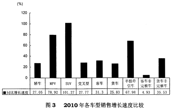 2010年,乘用车产销1389.71万辆和1375.78万辆,同比增长33.83%和 33.17%,增幅较上年回落20.28个百分点和19.76个百分点;商用车总体延续了上年快速增长态势,产销分别达到436.76万辆和430.41万辆,同比增长 28.19%和29.90%,增速与上年大致相当。