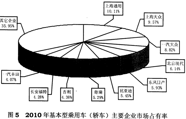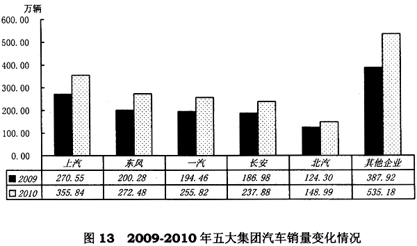 2010年,行业内大企业集团产销规模整体提升。与上年同期相比,上汽销量从270.55万辆提升至355.84万辆,同比增长31.52%;东风、一汽和长安跨入200万辆阵营,分别销售272.48万辆、255.82万辆和237.88万辆,同比分别增长36.05%、31.55%和27.22%。2010年,上汽、东风、—汽、长安和北汽共销售汽车1271.01万辆,占汽车销售总量的70%,其中乘用车共销售1005.69万辆,占乘用车销售总量的73%;商用车销售265.32万辆,占商用车销售总量的62%。销量排名五至十位的企业依次为:北汽、广汽、奇瑞、比亚迪、华晨和江淮,分别销售148.99万辆、72.42万辆、68.21万辆、51.98万辆、50.14万辆和45.85万辆,同比分别增长19,86%、13.74%、36.33%、15.93%、43.94%和42.46%。2010年,前十家企业共销售汽车1559.60万辆,占汽车销售总量的86%。