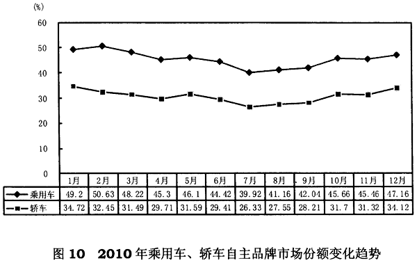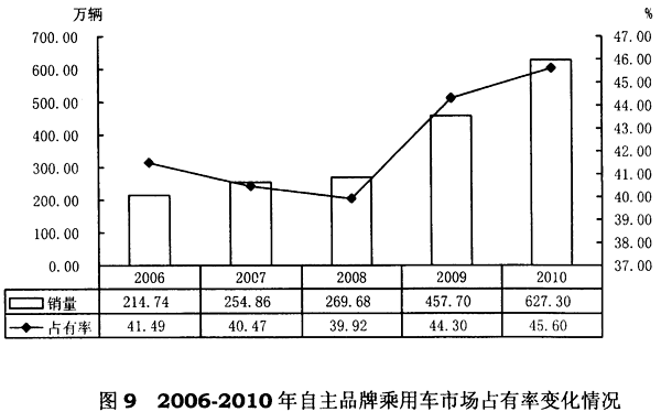 2010年,乘用车自主品牌共销售627.30万辆,占乘用车销售总量的45.60%,比上年提高1.30个百分点。日系、德系、美系、韩系和法系分别销售 268.84万辆、197.49万辆、141.21万辆、103.60万辆和37.34万辆,占乘用车销售总量的19.54%、14.36%、10.26%、7.53%和2.71%,与上年相比,日系、韩系占有率有所下降,德系、法系和美系呈一定增长。