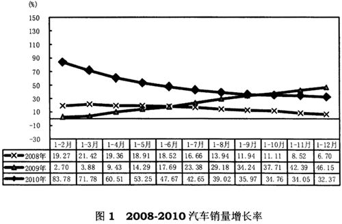 2010年,汽车产销分别达到1826.47万辆和1806.19万辆,同比分别增长 32.44%和32.37%,与上年同期相比,分别回落15.86个百分点和13.78个百分点。从2010年汽车月度产销变化情况来看,月均超过150万辆,创历史新高;但增速逐月回落态势明显,且由于上年基数关系,二季度、三季度累计产销量明显低于一季度,这与上年同期低开高走态势有所不同。