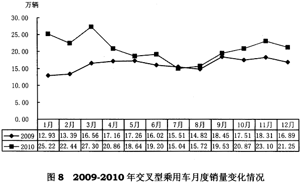 2010年,交叉型乘用车市场受优惠政策力度减弱的影响,增幅明显减缓。销售249.21万辆,同比增长27.77%,与上年同期相比,增幅减缓55.62个百分点。从细分品种来看,排量小于1升系列需求依旧强烈,共销售133.02万辆,同比增长59.60%,1升至1.6升系列市场需求增势呈快速下降,共销售115.61万辆,同比增长3.83%,增幅较上年减缓79.13个百分点。