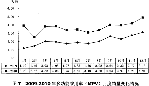 2010年,多功能乘用车(MPV)市场表现也较为出色,共销售44,54万辆,同比增长78.92%,增幅高于上年同期52.80个百分点。分排量来看,1.6升及以下排量MPV品种成为私人购买的主力,增速也最为迅猛。2010年,该系列共销售15.10万辆,同比增长3.9倍;2.0-2.5升继续占最大比重,共销售16.74万辆,同比增长47.47%,占MPV销售总量的37.58%;2.5升及以上大排量品种需求有所下降,共销售3.31万辆,同比下降2.94%。