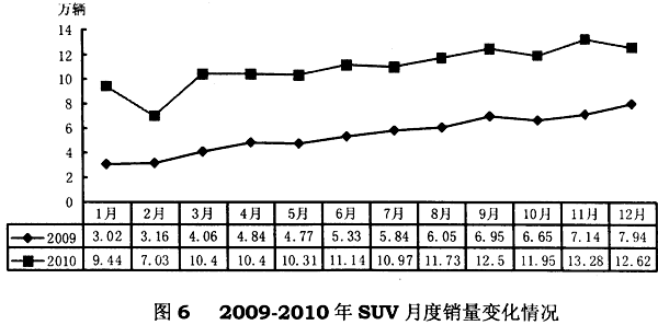 随着市场消费需求日趋多样化,运动型多用途乘用车(SUV)这一细分市场再度焕发了生机,2010年,SUV销量首次突破百万,达到132.60万辆,同比增长101.27%,高于同期乘用车行业增速68.10个百分点。其中:四驱SUV共销售57.57万辆,同比增长69.09%;两驱SUV共销售75.03万辆,同比增长 1.4倍。另外,2.0升及以下排量品种在保持市场占有率第一的同时,也继续呈现高速增长态势。2010年,该系列共销售79.98万辆,占SUV销售总量的60.32%,在四驱SUV品种中,2.0升及以下排量共销售30.11万辆,同比增长1.3倍;在两驱SUV品种中,该系列共销售49.87万辆,同比增长1.8倍。