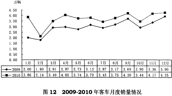 2010年,客车市场表现明显好于上年,共销售44.31万辆,同比增长 25.14%,增幅高于上年同期21.19个百分点。在客车主要品种中,大型客车增速最为明显,共销售6.88万辆,同比增长45.87%;轻型客车增速居次,共销售 28.44万辆,同比增长26.42%;中型客车增速相对略低,共销售8.99万辆,同比增长9.68%。
