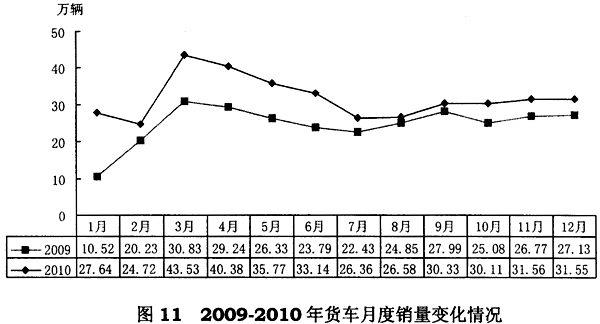 2010年,货车需求强劲,共销售386.11万辆,同比增长30.47%。在货车主要品种中,重型货车销售火爆,首次突破百万,达到101.74万辆,同比增长 59.93%,增幅高于上年同期42.22个百分点;中型、轻型和微型货车增幅较上年呈不同程度减缓,其中微型和中型货车增幅回落较快。2010年,微型货车销售 61.21万辆,同比增长19.90%,增幅较上年减缓52.90个百分点;中型货车销售27.18万辆,同比增长4.94%,增幅较上年减缓19.62个百分点;轻型货车销售195.98万辆,同比增长26.13%,增幅较上年减缓3.85个百分点。