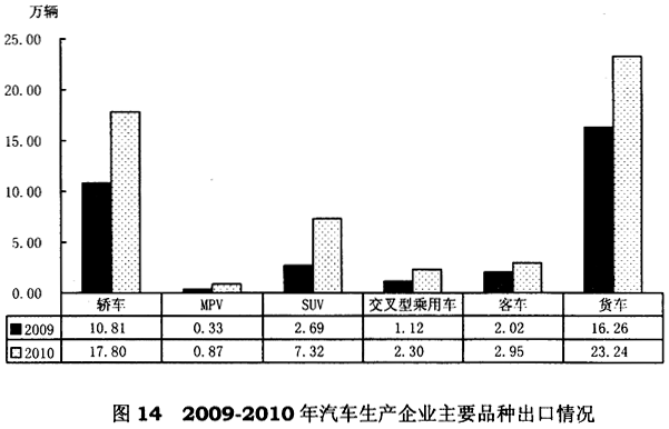 2010年,汽车企业出口摆脱了上年低迷的走势,呈现明显增长。据中汽协会对行业内整车生产企业报送的出口数据统计,2010年,共出口各类汽车54.49万辆,同比增长63.94%。其中乘用车出口28.29万辆,同比增长89.18%;商用车出口26.20万辆,同比增长43.28%。2010年,出口量位居前十位的企业依次为:奇瑞、长安、长城、东风、北汽、华晨、广汽、江南、力帆和江淮,分别出口9.20万辆、6.55万辆、5.54万辆、4.80万辆、3.73万辆、3.07万辆、2.51万辆、2.32万辆、2.27万辆和2.17万辆,与上年同期相比,除广汽略有下降外,其它企业均保持较快增长,其中奇瑞、东风和力帆增速更为迅猛。2010年,上述十家企业共出口汽车42.16万辆,占汽车出口总量的77%。