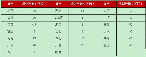 2011年为“十二五”规划的开局年,全国各省市也陆续公布了各自的新能源汽车发展规划。从产能规划来看,根据北汽集团(15万辆)、长安汽车集团在北京的新能源汽车生产基地(30万辆)以及中大燕京新建新能源客车基地(1万辆)的规划目标,到2015年,北京新能源汽车产能约为46万辆左右;长春将力争到2015年实现20万辆纯电动、混合动力等新能源汽车产能,建设全国新能源汽车生产研发基地;武汉计划加大新能源汽车研发力度,力争在2015年达到生产20万辆的总体目标;根据规划,到2015年南昌市将实现节能与新能源汽车3万辆的产能;河南省确定的“十二五”电动汽车的发展目标则是到2015年,电动汽车实现规模化生产,产能达到25万辆(包括电动客车、电动乘用车、电动专用车、电动场地车);“十二五”期间,重庆市新能源汽车产能将达到46万辆,深圳为20-30万辆,上海、襄阳、珠海分别为30万辆、20万辆、1万辆,而根据《安徽省新能源汽车产业技术路线图》的规划,到2015年,安徽省新能源汽车产业初步实现产业化,整车产能将达到20万辆以上。