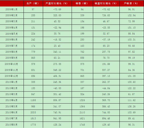 表1 2009年1月-2010年8月新能源汽车产销情况