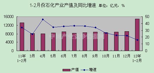 今年1-2月份石化产业延续去年四季度以来增幅回落的态势,累计实现工业总产值14917亿元,增幅由去年12月份22.1%的年内新低继续回落至16.2%,1月份和2月份的月度产值均低于去年12月份的水平。1-2月份石化产业增加值同比增长11%左右,与全国规模以上工业增加值增幅相当,其中炼油行业同比增长7%左右,化工行业同比增长13.4%。