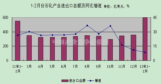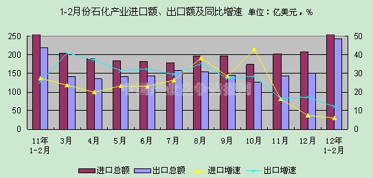 今年以来,石化产业对外贸易形势严峻,进出口增速较去年同期均呈下滑态势。1-2月份,石化产业对外贸易总额599亿美元,同比仅增长8.7%,增速较去年同期下降约18个百分点。其中进口355亿美元,同比增长6.4%,较去年下降约21个百分点;出口244亿美元,同比增长12.1%,较去年下降约13个百分点;前两个月贸易逆差111亿美元,与上年基本持平。