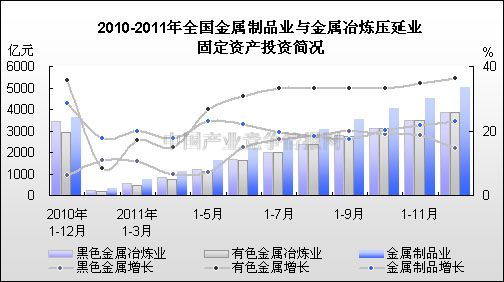 2011年以来,在国内需求强劲拉动下全国金属冶炼及压延加工业与金属制品业固定资产投资形势大好。其中金属制品业与有色金属冶炼及压延业行业投资增长保持平稳运行,有色金属冶炼及压延业累计投资增幅超过三成。金属制品业投资累计增幅维持在20%左右。黑色金属冶炼及压延业受铁矿石进口价格虚高影响,行业投资增长持续回落,行业经济运行相对低迷。截至2011年12月全国金属冶炼及压延加工业与金属制品业固定资产投资增幅呈现上升趋势。