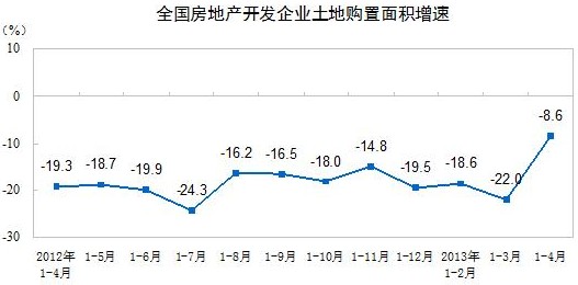 1-4月份,房地产开发企业土地购置面积8825万平方米,同比下降8.6%,降幅比1-3月份收窄13.4个百分点;土地成交价款2020亿元,增长10.6%,1-3月份为下降10.2%。