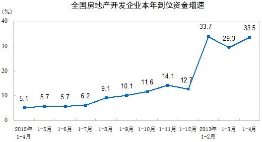 1-4月份,房地产开发企业到位资金35602亿元,同比增长33.5%,增速比1-3月份提高4.2个百分点。其中,国内贷款6618亿元,增长26.8%;利用外资163亿元,增长28.5%;自筹资金12952亿元,增长16.2%;其他资金15869亿元,增长55.9%。在其他资金中,定金及预收款9782亿元,增长61.9%;个人按揭贷款4373亿元,增长67.8%。
