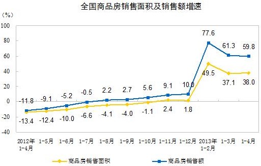 1-4月份,商品房销售面积29761万平方米,同比增长38.0%,增速比1-3月份提高0.9个百分点;其中,住宅销售面积增长41.1%,办公楼销售面积增长32.9%,商业营业用房销售面积增长5.8%。商品房销售额19847亿元,增长59.8%,增速比1-3月份回落1.5个百分点;其中,住宅销售额增长65.2%,办公楼销售额增长62.3%,商业营业用房销售额增长21.1%。