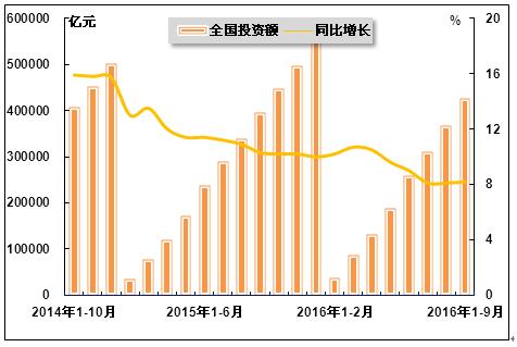 2016年9月,全国固定资产投资增速企稳并弱势回升,钢铁行业整体市场需求依然保持较大压力。国家统计局数据显示,2016年1-9月,全国固定资产投资(不含农户)累计完成426,906.4亿元,同比增长8.2%,增速比2016年1-8月上升0.1个百分点,比上年同期下降2.1个百分点。