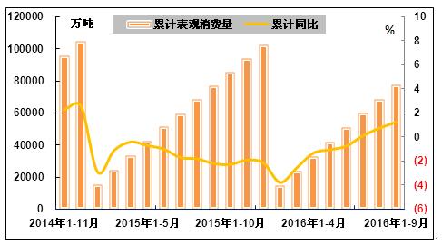 图8 2014年11月-2016年9月钢材表观消费量累计同比变动趋势