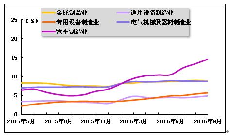 2016年9月,主要耗钢工业生产整体保持稳定,各行业累计增加值同比增速均有不同程度提高,主要耗钢工业的用钢需求将稳中有升。国家统计局数据显示,2016年1-9月,金属制品业、通用设备制造业、专用设备制造业、电气机械及器材制造业、汽车制造业累计增加值增长率分别为8.8%、4.9%、5.7%、8.7%、14.6%,比上年同期分别上升了1.2、1.5、2.3、1.4、9.7个百分点,与2016年1-8月相比,金属制品业和电气机械及器材制造业分别下降0.2和0.1个百分点,通用设备制造业、专用设备制造业和汽车制造业分别上升了0.3、0.3和1.2个百分点。