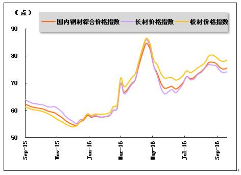 2016年9月,随着前期钢铁产量的稳定增加,钢铁供应量逐步加大,推动钢铁价格由升转降,窄幅波动,但与上年同期相比仍处于高位。中国钢铁工业协会统计数据显示,截至2016年9月末,国内钢材综合价格指数为75.6,比2016年8月末下降1.9点,比上年同期提高14.4点;长材价格指数为74.2,比2016年8月末下降2.7点,比上年同期提高11.6点;板材价格指数为78.5,比2016年8月末下降1.4点,比上年同期提高18.2点。