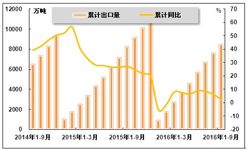 图11 2014年9月-2016年9月钢材累计出口量及同比走势