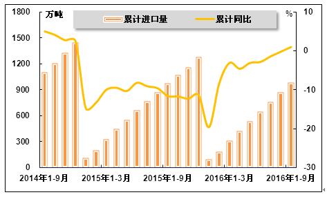 2016年9月,随着国内钢铁行业逐渐回暖、市场需求逐步改善,钢材累计进口量在连续二十个月负增长后首次转正。海关总署数据显示,2016年1-9月,我国累计进口钢材983.0万吨,同比增长1.0%,而2016年1-8月和上年同期分别为下降0.2%和11.6%。