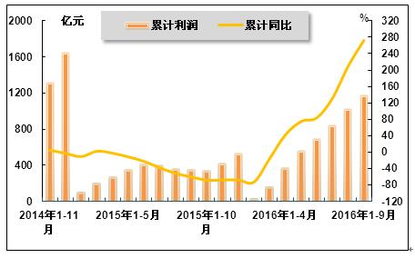 2016年9月,虽然价格略有波动并有所下降,但受前期钢价整体持续上扬、行业逐步回暖影响,在去年同期较低的利润基数上,钢铁行业利润延续了大幅增长态势,同比增幅连续六个月迅猛扩大。国家统计局数据显示,2016年1-9月,钢铁行业累计实现利润总额1,166.4亿元,同比增长272.4%,增速比2016年1-8月上升62.8个百分点,而上年同期为同比下降60.5%。