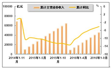 图13 2014年11月-2016年9月累计钢铁行业主营业务收入及同比增长率变动趋势