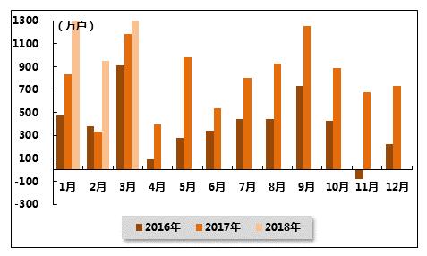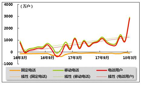 图 2 2016年3月-2018年3月固定电话、移动电话和电话用户总数各月新增数量比较