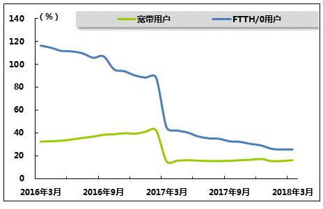 图 8 2016年3月-2018年3月互联网宽带用户同比增长趋势比较