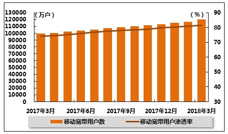 图 6 2017年3月-2018年3月移动宽带用户(3G和4G)及渗透率变化趋势