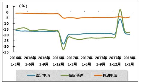 移动通话业务量持续下滑。受移动电话用户的增长放缓和互联网应用发展等因素影响,移动通话业务量持续负增长。2018年1-3月,全国移动电话去话通话时长6282.0亿分钟,同比下降4.2%,降幅比上月收窄0.7个百分点,比上年同期收窄0.6个百分点。