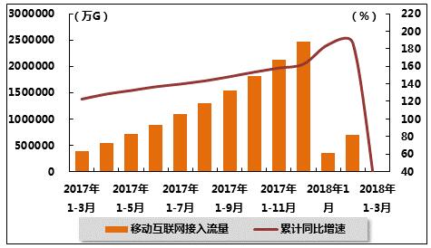 移动互联网接入流量保持高速增长。受“互联网+”战略实施、信息消费快速发展、4G电话用户大幅增长和流量资费不断降低的影响,移动互联网流量消费需求得到持续释放,推动移动互联网流量保持高速增长。2018年1-3月,移动互联网接入流量111.8亿G,同比增长191.5%,增速比上月回升5.2个百分点,比上年同期回升68.8个百分点,仍保持高速增长。其中,通过手机上网的流量达到109.0亿GB,同比增长210.0%,占移动互联网总流量比重达到97.8%。