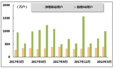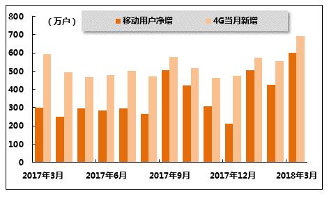图 17 2017年3月-2018年3月中国移动各月新增用户及4G用户数量
