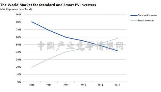在《世界光伏逆变器市场报告》中显示,如无功功率、智能电网以及能量储存等功能正在把逆变器从一个简单的功率转换器转变成电网基础设施的重要组成部分,并将在未来五年中彻底改变光伏逆变器市场。IMSResearch的光伏研究分析师TomHaddon表示:“公用事业单位,尤其的在欧洲的公用事业单位,开始更积极的推动逆变器在稳定电网中起到的协助作用,并使其符合更严格的技术要求。”正因为如此,IMSResearch预测智能逆变器到2015年将在EMEA(欧洲、中东和非洲)市场占有80%的市场份额。Haddon表示:“尽管如此,大部分的逆变器仍然不能‘完全智能’,将只会具有无功功率的功能,而不具备完全智能的电网互动或能量存储功能。”